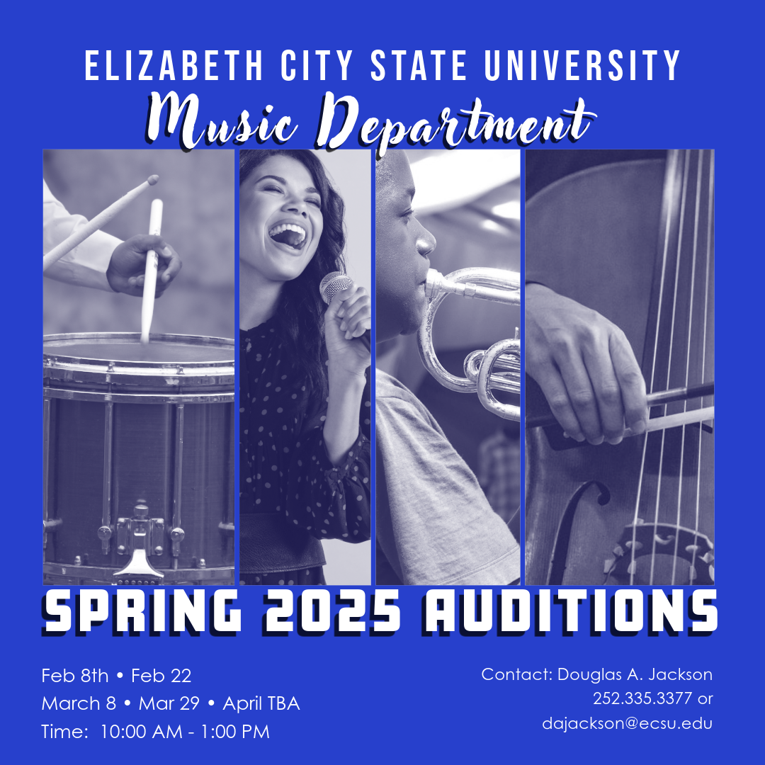 All prospective students must audition before being accepted into a program of study. Auditions occur before a panel of faculty. Each student must perform works from the standard repertoire for their voice/instrument and demonstrate a level of proficiency in music reading. Students who successfully pass their auditions are enrolled in applied lessons. Audition procedures are the same for those students who wish to minor in music. Prospective students audition in person; however, video submissions shall be pre-screened by the music faculty. Should the music faculty deem the quality and content of the video insufficient, the applicant will be required to addition in person. Prospective students should email the approved video submission to: vlprice@ecsu.edu.