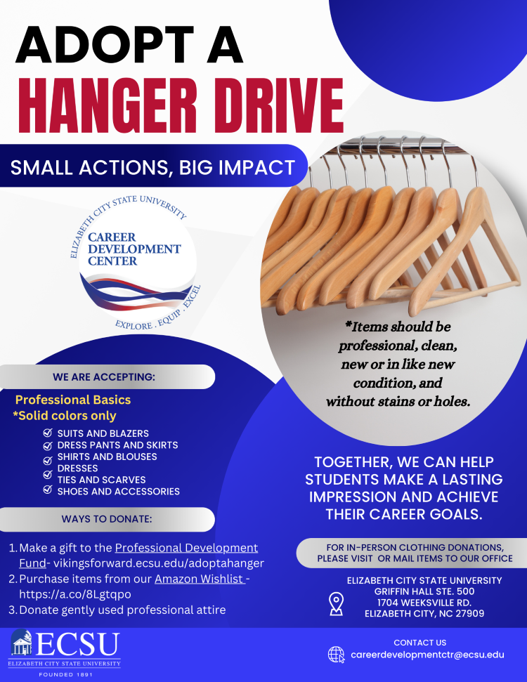 At this time, we are accepting professional attire ONLY for donations. Donations can be arranged by contacting the Career Center by email: careerdevelopmentctr@ecsu.edu to coordinate drop-off.